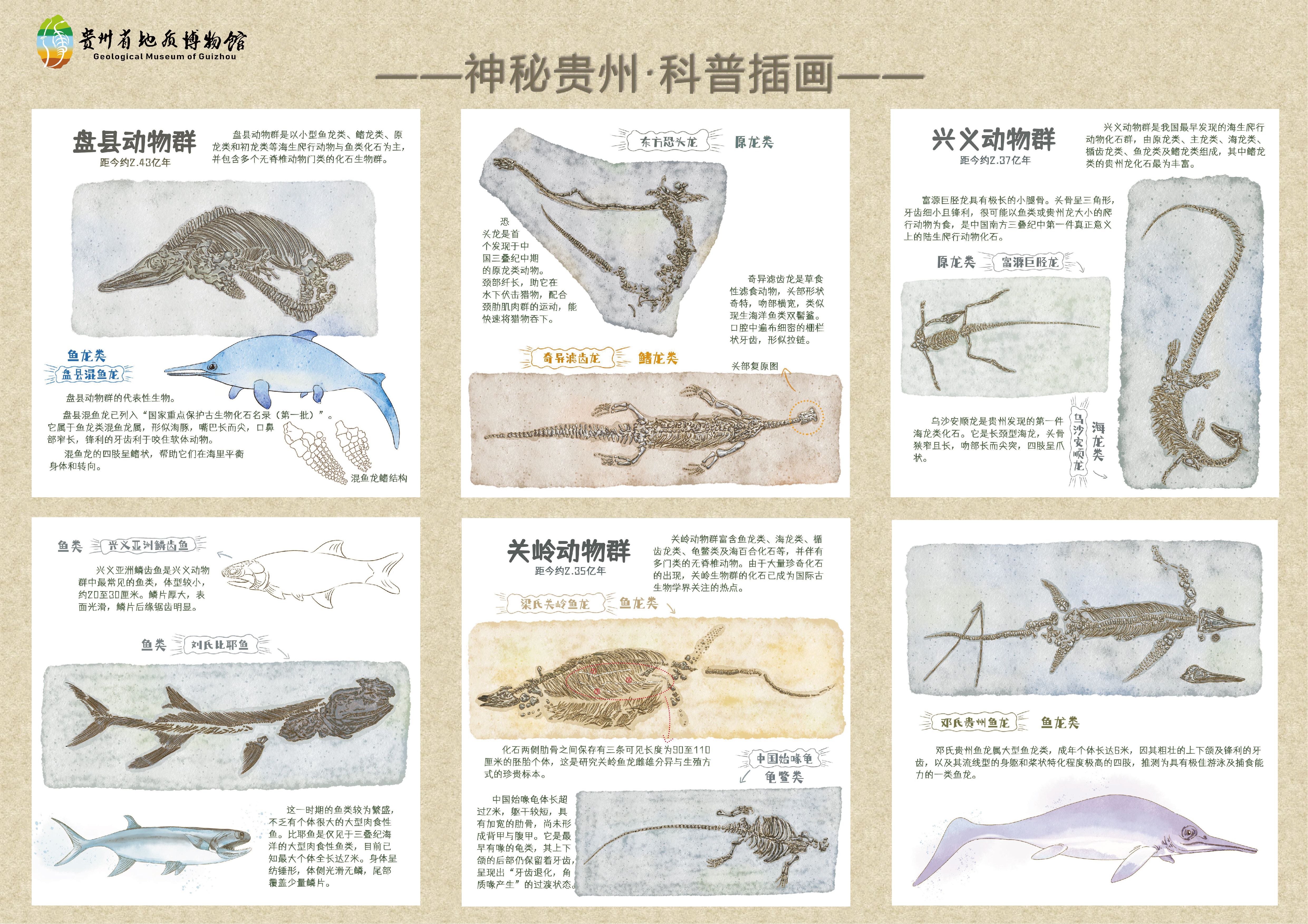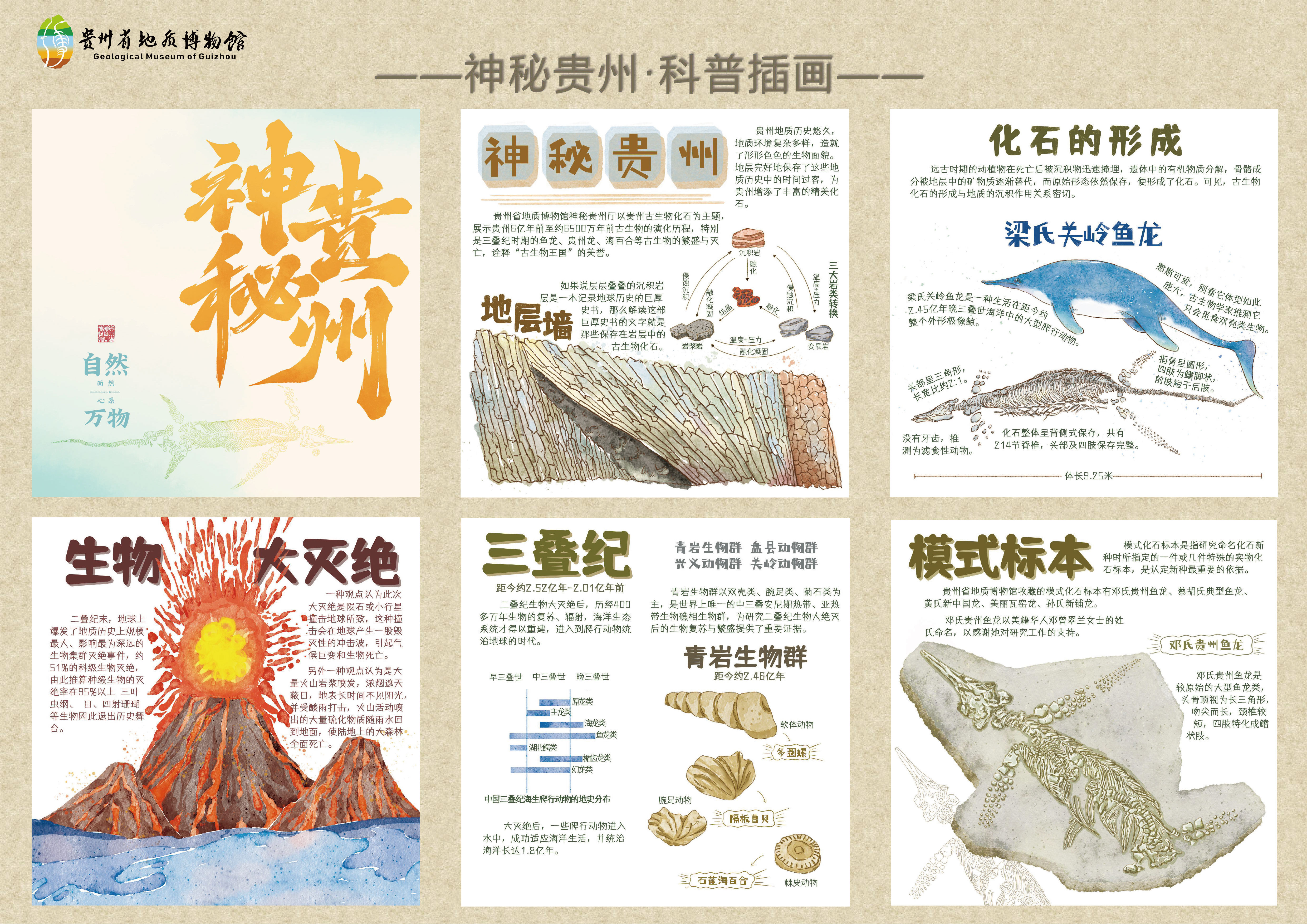 动物生命起源,从贵州拉开序幕。本系列插画引领我们研读贵州岩层这部“沉积巨著”,在这个过程中见证贵州远古时期的生态环境变化与古生物们鲜活身影的消逝,通过化石去聆听不同地质历史时期的生命进行曲,解读古生物们神秘又苦难的生命历程。