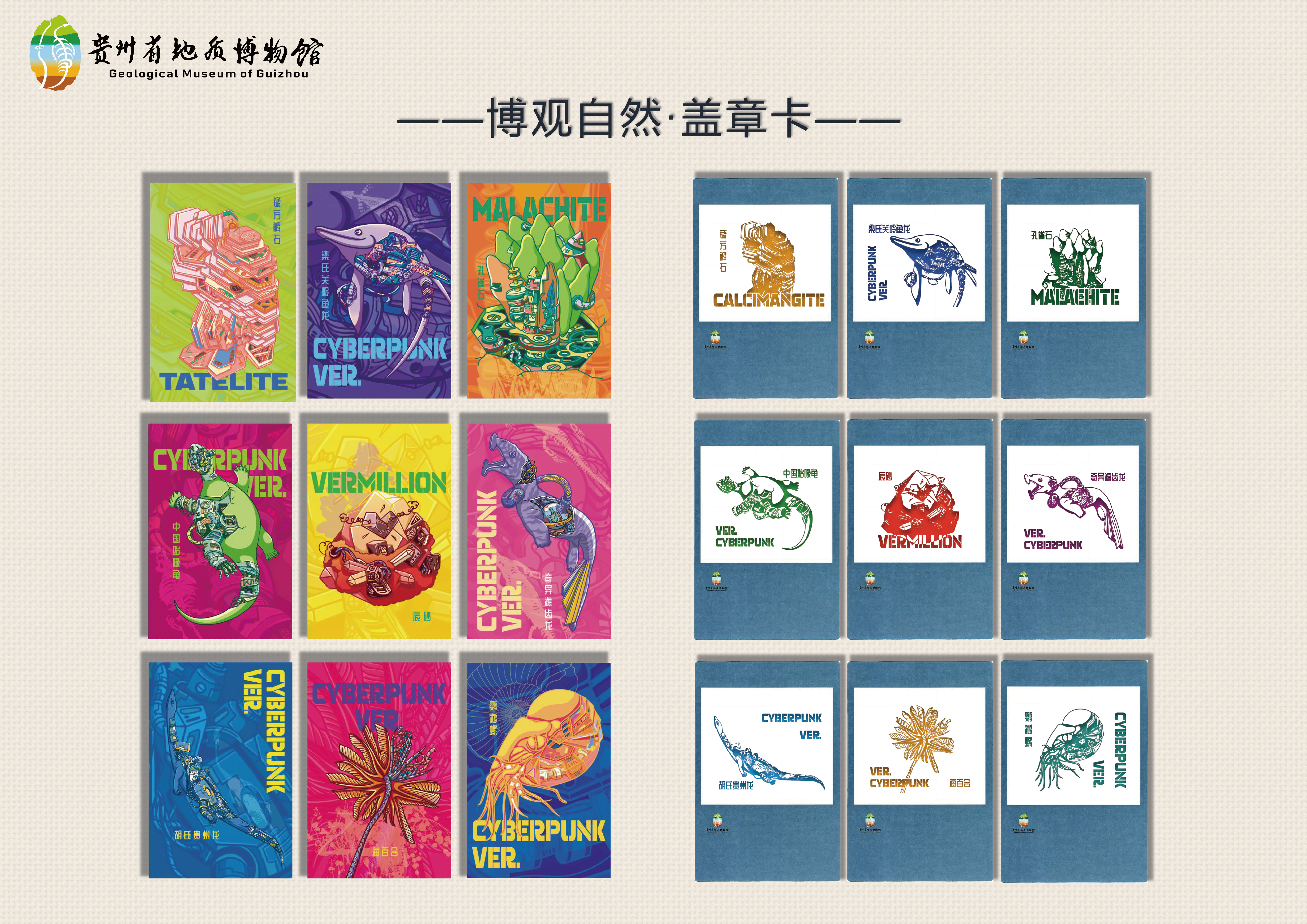 “博观自然”,突出博物机构博古通今、博采众长的文化特性。本系列文创以梁氏关岭鱼龙、海百合、孔雀石等贵州古生物和矿物代表为原型,运用多彩的颜色绘制出赛博朋克风格的图案,再现了海底生物群蓬勃的生命力与矿晶本身华丽的模样,实现“自然文化+科技感”的全新体验。