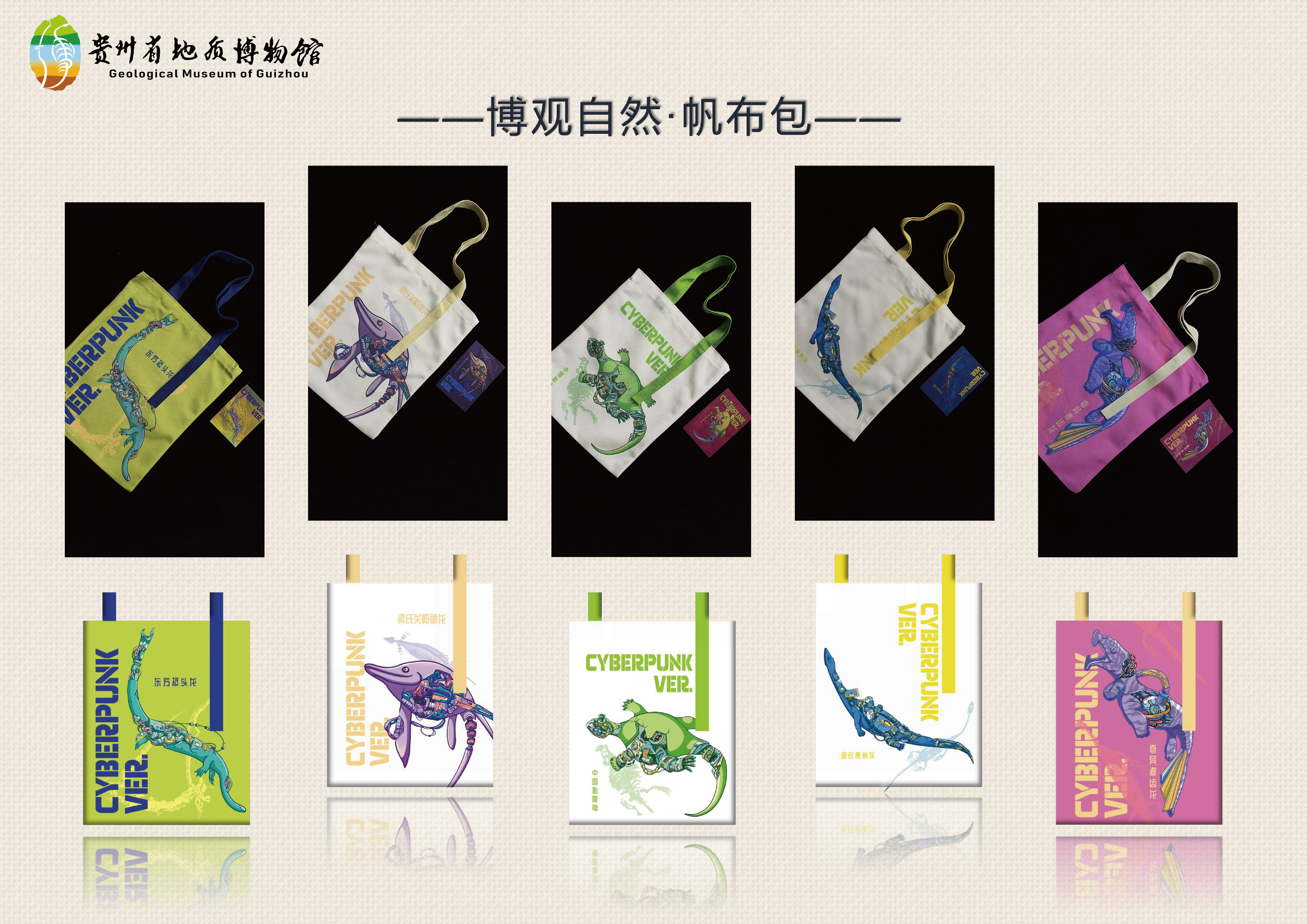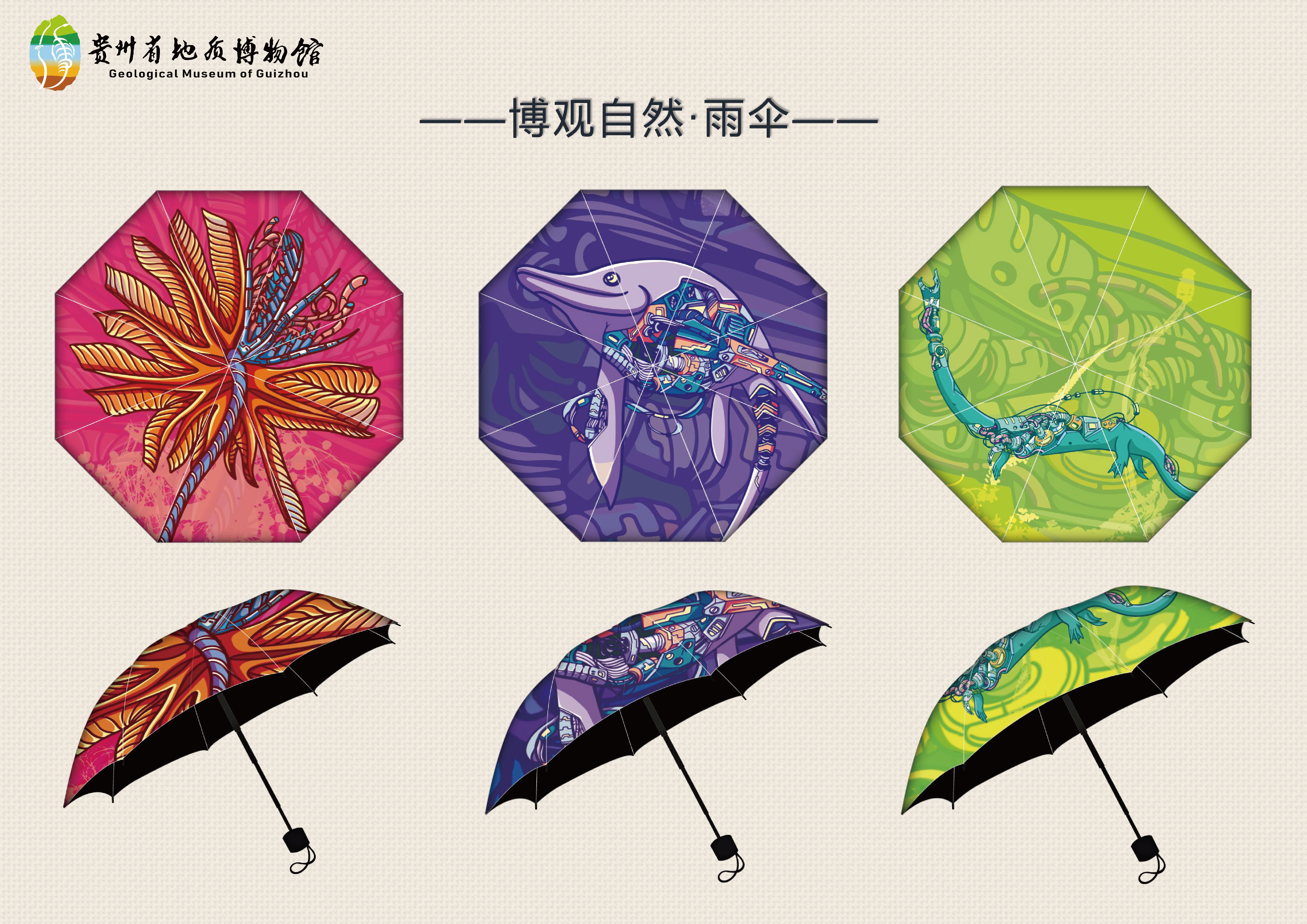 “博观自然”,突出博物机构博古通今、博采众长的文化特性。本系列文创以梁氏关岭鱼龙、海百合、孔雀石等贵州古生物和矿物代表为原型,运用多彩的颜色绘制出赛博朋克风格的图案,再现了海底生物群蓬勃的生命力与矿晶本身华丽的模样,实现“自然文化+科技感”的全新体验。